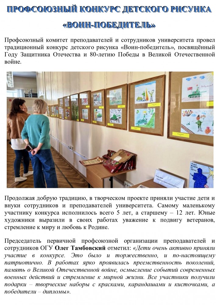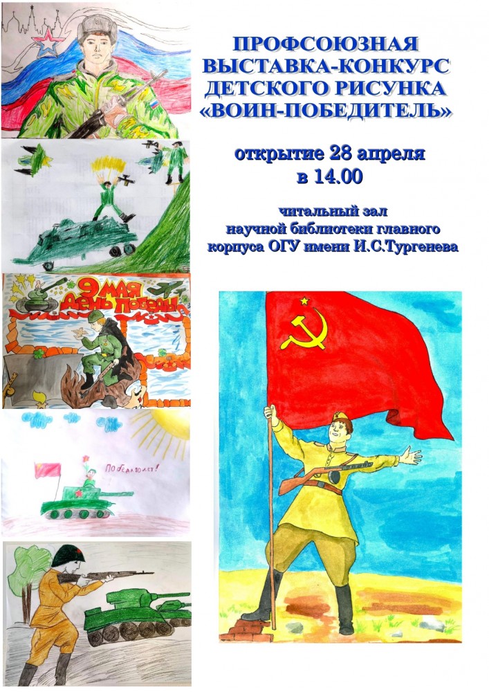 Первичная профсоюзная организация преподавателей и сотрудников ФГБОУ ВО «Орловский государственный университет имени И.С.Тургенева» объявляет конкурс детского рисунка «Воин - победитель», посвященный 80-летию Победы в Великой Отечественной войне и Году защитника Отечества.
