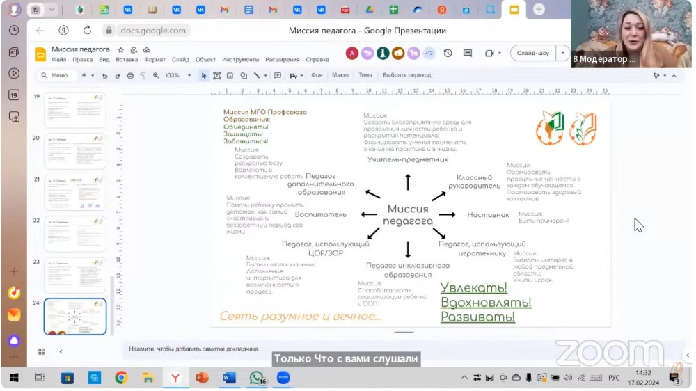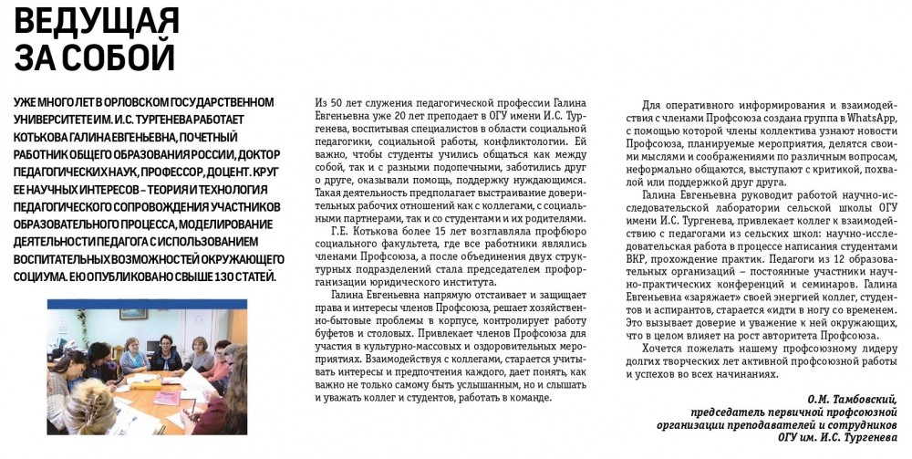 На торжественной церемонии награждения председатель областной организации Профсоюза, Скуридин Владимир Александрович, поздравил победителей конкурса с заслуженными наградами. Ведь это не просто конкурс, это признание труда тех, кто вдохновляет и ведет за собой. Среди лучших наставников области, которые своим постоянным трудом и примером вдохновляют и поддерживают нас, стала председатель профсоюзной организации юридического института Орловского государственного университета имени И.С. Тургенева, профессор кафедры социального управления и конфликтологии, доктор педагогических наук, Котькова Галина Евгеньевна.