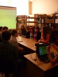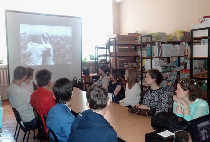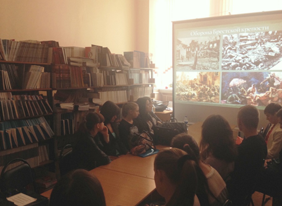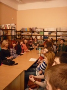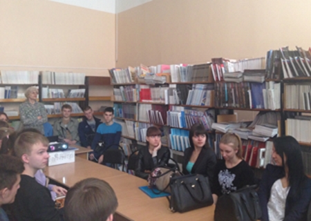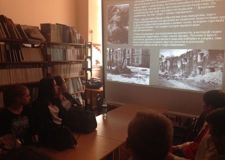 27 апреля в читальном зале №4 библиотеки главного корпуса состоялось мероприятие «Свидетели войны», посвящённое 70-й годовщине Победы в Великой Отечественной войне. На встрече присутствовали студенты группы 13-Ю (20 человек), преподаватель Мишечкина В.В., сотрудники библиотеки. Студенты обсуждали повесть А. Адамовича «Немой» об истории любви белорусской девушки и немецкого солдата во время Великой Отечественной войны, посмотрели фрагмент фильма «Franz + Полина.