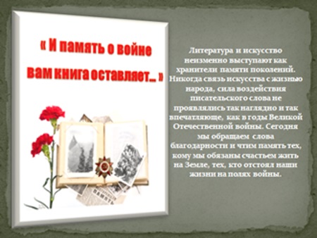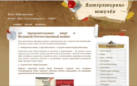 На страницах блога библиотеки размещён пост «Десять пронзительных книг о Великой Отечественной войне». Сюда вошли сведения о таких произведениях как: «Завтра была война», «А зори здесь тихие» Б. Васильева, «Горячий снег» Ю. Бондарева, «Живи и помни» В. Распутина и т.д. Это книги о жизни, о воле к победе, о подвигах, которые останутся в нашей памяти навеки, о чувствах и героизме, отношениях, мечтах, любви. Это книги, которые должен прочесть каждый!