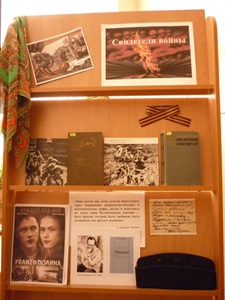 Также была организована выставка «Свидетели войны». На выставке была представлена художественная и справочная литература о Великой Отечественной войне (всего 10 экз.), фотографии и иллюстрации военных лет, предметы одежды.