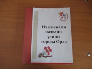 На абонементе № 3 корпуса Научприбор оформлена папка «Их именами названы улицы города Орла», где представлен материал о военноначальниках, командирах и рядовых солдатах Великой Отечественной Войны, судьбы которых связаны с нашим городом. Многие из них воевали на территории Орловской области, освобождали Орел в 1943 году, многие из них погибли и похоронены на Орловской земле. Их имена – танкист Михаил Антонов, похороненный на Троицком кладбище; генерал А. В. Горбатов, памятник которому установлен на бульваре Победы; генерал А. С. Жадов - наш земляк; генерал А. Г. Родин; генерал Л. Н. Гуртьев, похороненный на Троицком кладбище; маршал бронетанковых войск М. Е. Катуков; директор Орловский школы № 26 – участник партизанского движения А. Комаров; наш земляки летчики Николай Кукушкин и Иван Леонов и многие другие, чьи имена бессмертны в нашей памяти.