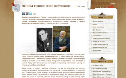 28 апреля в блоге «Литературные штучки» размещег пост о романе Д. Гранина «Мой лейтенант». Даниил Гранин - автор знаменитых романов «Иду на грозу», «Зубр», «Картина» и других произведений. В блоге представлена информация о романе "Мой лейтенант", повествующем о начале войны в ополчении под Ленинградом. «Мой лейтенант» - это исповедальный роман Даниила Гранина, взгляд на Великую Отечественную войну не с точки зрения генералов и маршалов, а из траншей и окопов. Автор дает возможность выговориться простому лейтенанту, одному из тех, кому мы обязаны победой.