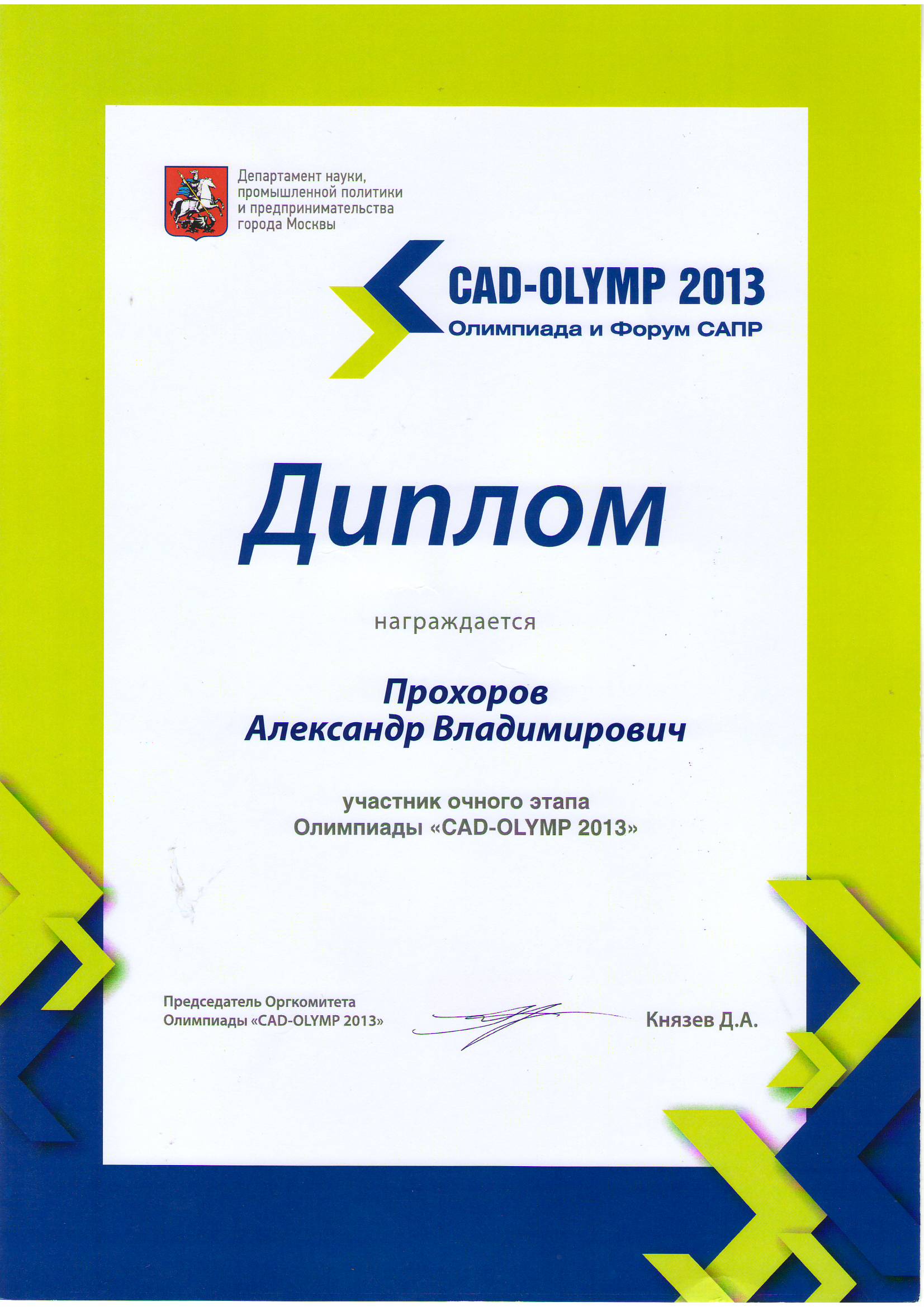 Студенты групп К-31 и К-11 Александр Прохоров и Андрей Катунин совместно с преподавателями Д.А. Ветчинниковым и П.В. Игнатовым приняли участие в Международной олимпиаде по системам автоматизированного проектирования «CAD-OLYMP-2013» и форуме САПР, прошедшими в период с 5 по 6 декабря 2013 года в г. Москве на базе национального исследовательского ядерного университета «Московский институт ядерной физики». По итогам олимпиады Карачевский филиал Госуниверситета-УНПК завоевал кубок «Олимпиада CAD-OLYMP-2013», участники командного зачёта награждены дипломами департамента промышленной политики и предпринимательства г. Москвы. Победители олимпиады получили также сертификаты участников мастер-класса по созданию «быстрых прототипов» и «3D-моделей».