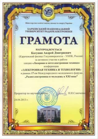 27) XVII молодёжный международный научный форум «Радиоэлектроника и молодёжь в XXI веке, проведённый в Харьковском национальном университете радиоэлектроники – ХНУРЭ (Украина, г. Харьков, 22-24 апреля 2013 г.).