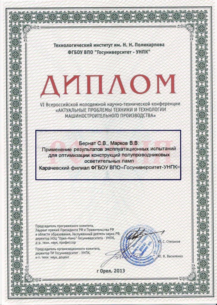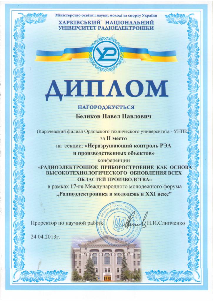24) VI студенческая региональная научно-техническая конференция «Актуальные проблемы техники и технологии машиностроительного производства» – Технологический институт им. Н.Н. Поликарпова Госуниверситета-УНПК (г. Орёл, 19 апреля 2013 г.).