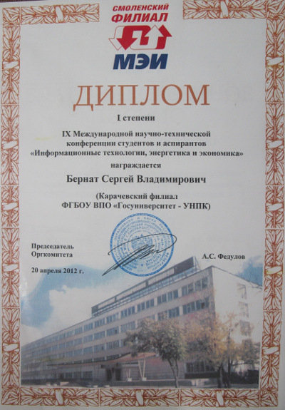 Студент группы Т-31 Сергей Бернат занял первое место в конкурсе студенческих научных работ в секции «Энергосбережение в технике и технологиях», проведённом в рамках IX международной научно-технической конференции студентов и аспирантов «Информационные технологии, энергетика и экономика» в