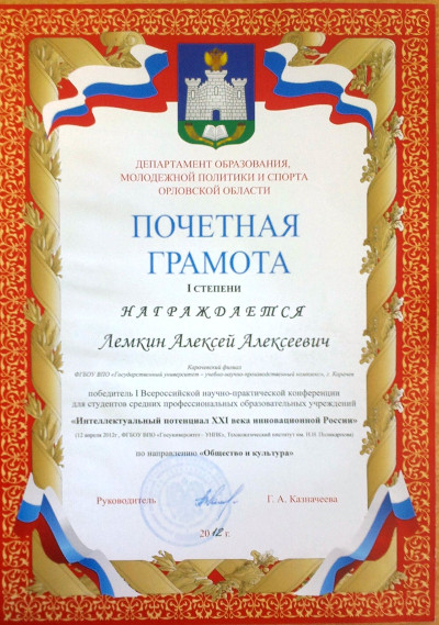 Студент группы То-35 Алексей Лемкин стал лауреатом конкурса студенческих научных работ, проведённого в рамках II молодежного научно-технического форума «Поликарповские чтения» в Технологическом институте им. Н.Н. Поликарпова Госуниверситета-УНПК, г. Орёл, 12 апреля 2012 г. Тема работы – «Нам есть, чем гордиться, нам есть, что беречь!», приз – диплом I степени департамента образования Правительства Орловской области в номинации «Общество, история, краеведение».