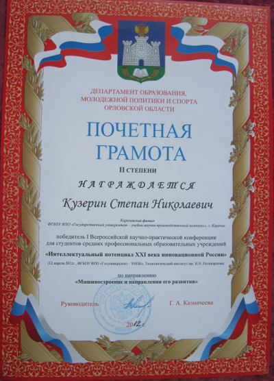 Студент группы То-25 Степан Кузерин стал победителем конкурса студенческих научных работ, проведённого в рамках II молодежного научно-технического форума «Поликарповские чтения» в Технологическом институте им. Н.Н. Поликарпова Госуниверситета-УНПК, г. Орёл, 12 апреля 2012 г. Тема работы – «Технология лазерной резки материалов», приз – диплом II степени департамента образования Правительства Орловской области в номинации «Машиностроение и направления его развития».