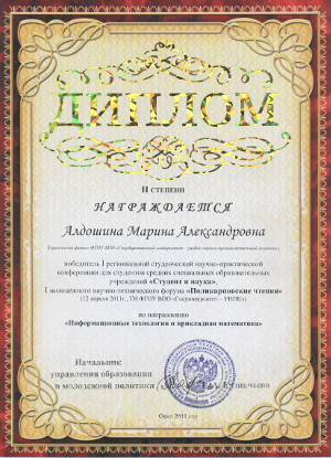 Студентка М-31 Марина Алдошина заняла второе место в номинации «Информационные технологии и прикладная математика». Тема работы – Применение методов математического моделирования для решения проблемы выбора профессии абитуриентами.