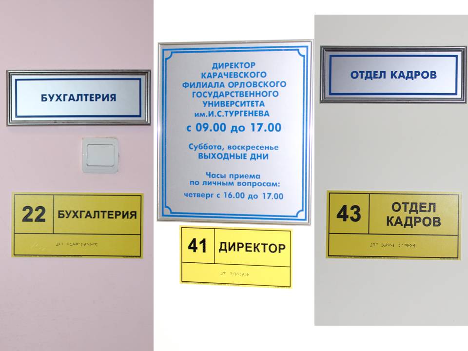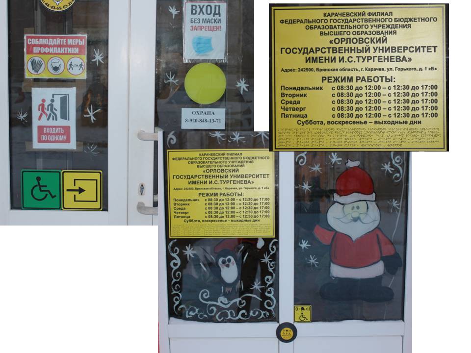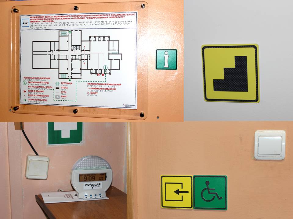 - носители информации, необходимой для обеспечения беспрепятственного доступа инвалидов к объектам и услугам университета размещаются с учетом ограничений их жизнедеятельности, в том числе осуществляется дублирование необходимой для получения услуги звуковой и зрительной информации, а также надписей, знаков и иной текстовой и графической информации знаками, выполненными рельефноточечным шрифтом Брайля и на контрастном фоне.