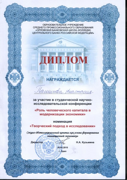 29 мая 2015 года студенты группы Эк-4-67 Глухова Инна и Пашинова Анастасия приняли участие в студенческой научно-исследовательской конференции «Роль человеческого капитала в модернизации экономики», проводимой Образовательным учреждением среднего профессионального образования Орловская банковская школа (колледж) Центрального банка Российской Федерации. Наши студенты показали высокий уровень умения грамотно и структурировано представлять результаты своих исследований и стали победителями в номинации «Оригинальное исследование» (Глухова И.А.) и «Творческий подход в исследовании» (Пашинова А.В.).