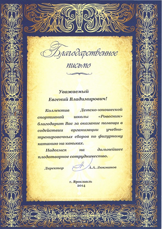 Коллектив Ярославской Детско-юношеской спортивной школы "Ровесник" благодарит директора Мценского филиала Госуниверситета-УНПК Е.В.Жарких за оказание помощи в содействии организации учебно-тренировочных сборов по фигурному катанию на коньках.