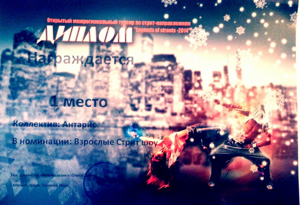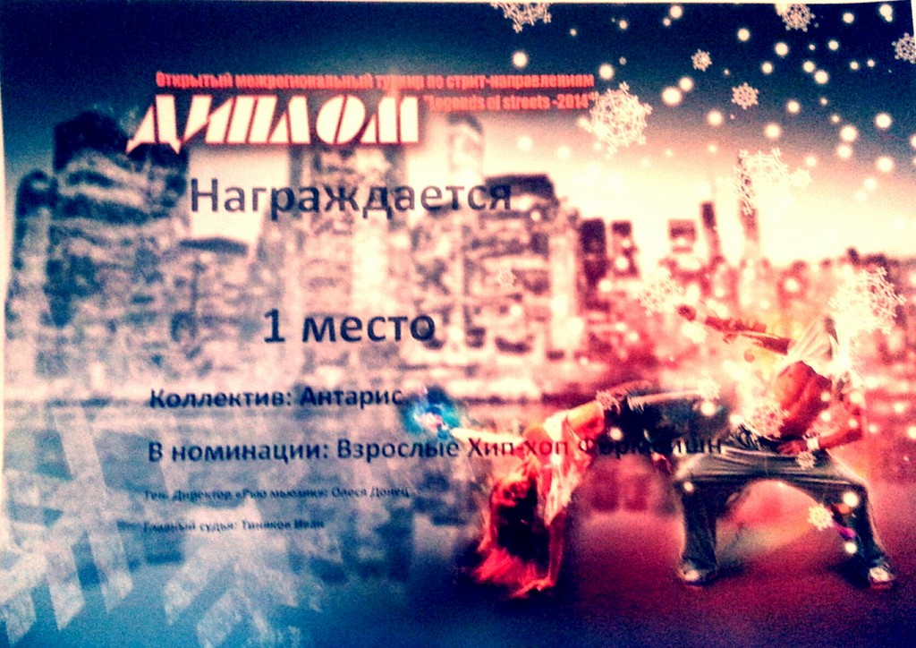 7 декабря 2014г. на базе СК МЕГА ГРИНН проходил открытый межрегиональный турнир по стрит-танцу «LEGENDS OF STREETS-2014» в котором принял участие наш танцевальный коллектив «Антарис» под руководством Кирилкиной Д.В. Мы поздравляем участников коллектива с достойной победой: 1 место в номинации: взрослые Стрит-шоу; 1 место в номинации : взрослые Хип-хоп Формейшн.