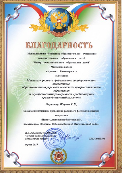 23 апреля 2015г. на базе Мценского филиала Госуниверситета-УНПК состоялся праздничный концерт художественной самодеятельности и выставки декоративно-прикладного творчества в рамках районного фестиваля детского творчества «Память, которой не будет конца», посвященного 70-летию Победы в ВОВ. Студенты- волонтеры встречали участников художественной самодеятельности, были активными помощниками на протяжении всего мероприятия.