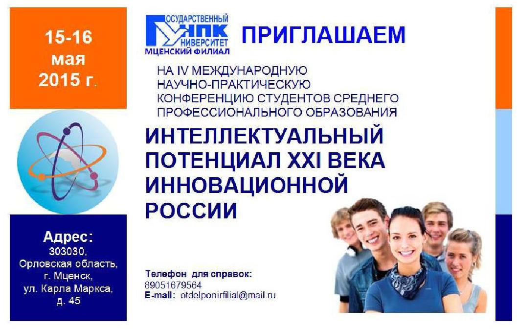 15-16 мая 2015 года на базе Мценского филиала Госуниверситета-УНПК прошла Четвертая Международная научно-практическая конференция студентов среднего профессионального образования «ИНТЕЛЛЕКТУАЛЬНЫЙ ПОТЕНЦИАЛ XXI ВЕКА ИННОВАЦИОННОЙ РОССИИ».