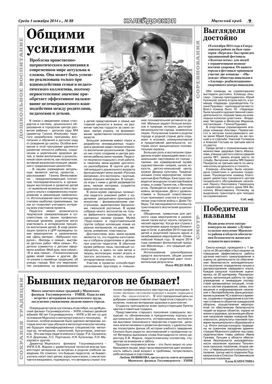 С 2006 года Национальным советом социальной информации проводится ежегодный открытый Национальный конкурс социального проектирования «Новое пространство России». Студенты Мценского филиала Госуниверситета-УНПК в этом учебном году впервые приняли участие в этом конкурсе. Совсем недавно подведены итоги регионального этапа. Дипломом I степени в возрастной категории "Молодежь" в номинации "Мир начинается с уважения" награждена студентка Мценского филиала Госуниверситета-УНПК Суворина Лариса (рук. Афанасьева Е.Н.).