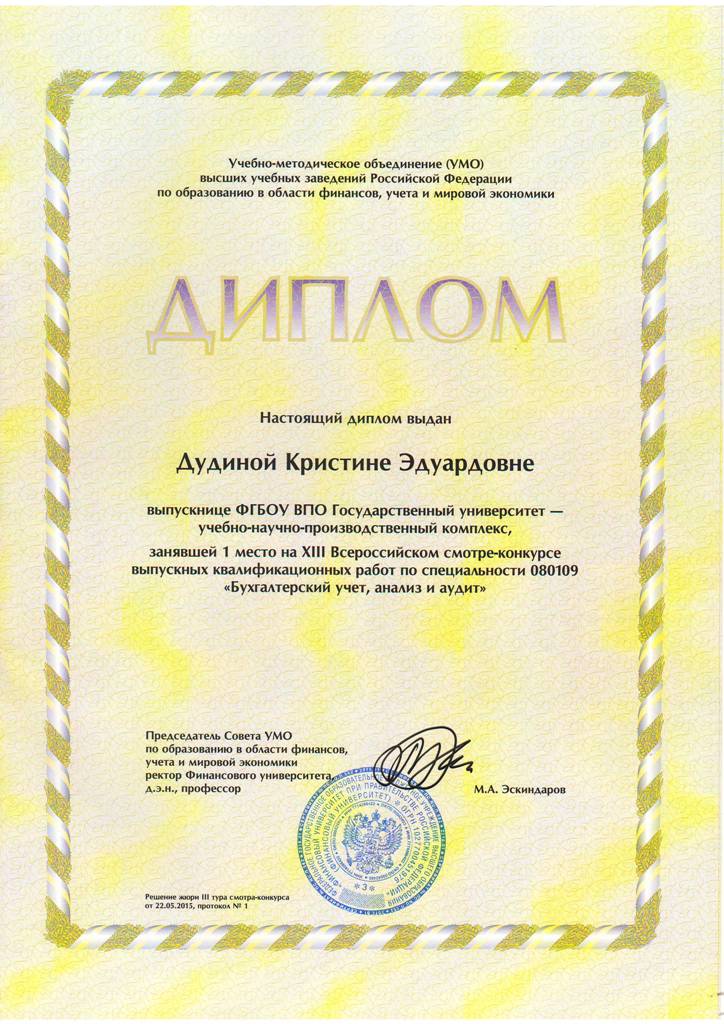 Совет Молодых ученых поздравляет Дудину Кристину Эдуардовну , занявшую первое место на XIII Всероссийском смотре-конкурсе выпускных квалификационных работ по специальности 080109 "Бухгалтерский учет, анализ и аудит"