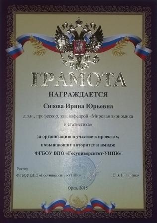 Дополнительная информация: Областью научно-образовательной деятельности является разработка региональных Комплексных программ и долгосрочных прогнозов эколого-экономического развития, комплексных программ научно-технического развития, формирование разноуровневых инновационных систем в условиях перехода к устойчивому развитию, Разработка научных направлений по эколого-экономическим проблемам в проектах MAB UNESCO. Научные результаты исследований внедряются в образовательный процесс подготовки кадров высшего профессионального образования. Осуществляет руководство аспирантами и докторантами. Под руководством Сизовой И.Ю. 11 аспирантов защитили кандидатские диссертации. 4 аспиранта и 1 соискатель работают над диссертациями. С 1987 года является членом национального комитета MAB UNESCO. В 1998 году присвоено звание академика Международной Академии наук экологии и безопасности (МАНЭБ), ассоциированной в ООН (г. Санкт-Петербург). С 2002 года входит в состав диссертационных советов по защите докторских диссертаций по следующим специальностям: Экономика и управление народным хозяйством (промышленность), Управление инновациями, маркетинг, экономическая теория, финансы и кредит и бухгалтерский учет и статистика. С 2005 г. является членом УМО вузов по статистике, мировой экономике. С 2006 г. по договору с Московской академией экономики и права, совместно с ситуационным центром активно продвигается прикладная инновационная образовательная программа ТТРП «ЭВРИКА», направленная на развитие креативного мышления у школьников и студентов экономических специальностей. С 2007 года под руководством И.Ю. Сизовой на базе кафедры ежегодно проводятся две международные научно-практические конференции, по результатам которых публикуются сборники, индексируемые в базе данных РИНЦ. С 2009 г. является членом редакционной коллегии Журнала "Вестник Орловского государственного университета: новые гуманитарные исследования", который включен в перечень ВАК РФ и научно-теоретического журнала "Системная инженерия" секция "Экономика и управление народным хозяйством. Финансы. Статистика. Математические методы экономики". С 2023 г. является членом редколлегии рецензируемого научно-практического журнала «Социально-экономическое управление: теория и практика» включен ВАК России в перечень ведущих научных журналов, в которых публикуются основные научные результаты диссертаций на соискание ученой степени кандидата и доктора наук. Журнал зарегистрирован Управлением Федеральной службы по надзору в сфере связи, информационных технологий и массовых коммуникаций по Удмуртской Республике, свидетельство ПИ № ТУ 18-00712 от 10 января 2022 г. С 2010 г. руководит международной программой по академической мобильности студентов и преподавателей по договору с Лицеем Либержье (в том числе программой двойных дипломов). В 2012 году прошла курсы повышения квалификации по программе "Основные направления международной деятельности вуза на современном этапе" в РУДН (г. Москва). В 2016 году пройден курс "Академическое письмо" в рамках планового прохождения стажировки в ФГБОУ ВО "ОГУ им. И.С. Тургенева". С 2014 г. осуществляет общее руководство международной программой "Новое поколение", модуль "Международная торговля и современные коммуникации" на английском языке, осуществляемой на базе 