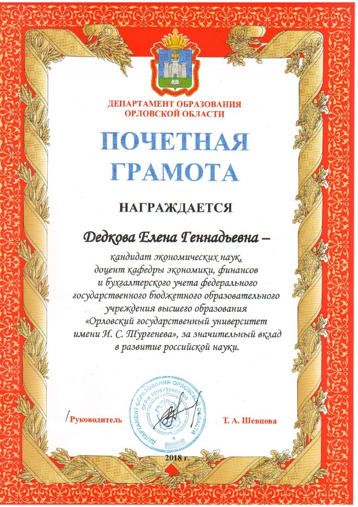 Публикации: 1. Дедкова, Е.Г. и др. Учетно-контрольная система оплаты труда и начислений на заработную плату / Е.Г. Дедкова, И.А. Коростелкина // Экономические и гуманитарные науки. - 2025. - № 8. - C.3-10. Doi: . [Электронный ресурс]. - URL: . 2. Дедкова, Е.Г. и др. Электронные сервисы ФНС России: эффективность, проблемы и перспективы цифровизации / Е.Г. Дедкова, М.М. Коростелкин // Экономические и гуманитарные науки. - 2025. - № 7(402). - C.37-49. Doi: . [Электронный ресурс]. - URL: . 3. Дедкова, Е.Г. и др. Анализ и оценка сбережений населения в условиях экономической нестабильности / Е.Г. Дедкова, И.А. Коростелкина // Экономические и гуманитарные науки. - 2024. - № 11(394). - C.29-41. Doi: 10.33979/2073-7424-2024-394-11-29-41. [Электронный ресурс]. - URL: . 4. Васильева, М.В. и др. БЕЗОПАСНОСТЬ ГОСУДАРСТВА И ЭКОНОМИЧЕСКИХ СУБЪЕКТОВ: ВОПРОСЫ ИДЕНТИФИКАЦИИ И ОЦЕНКИ РИСКОВ: монография / М.В. Васильева, Е.Г. Дедкова, И.А. Коростелкина. - Орловский государственный университет имени И.С. Тургенева, 2024. - C.146. [Электронный ресурс]. - URL: https://elibrary.ru/item.asp?id=77501893. 5. Дедкова, Е.Г. и др. НАПРАВЛЕНИЯ СОВЕРШЕНСТВОВАНИЯ ЭКОНОМИКО-ПРАВОВЫХ МЕР ПРОТИВОДЕЙСТВИЯ КОРРУПЦИИ / Е.Г. Дедкова, М.М. Коростелкин, А.А. Морозов // МЕНЕДЖМЕНТ В СОВРЕМЕННОМ ОБЩЕСТВЕ : ТЕХНОЛОГИИ БУДУЩЕГО И НАСТАВНИЧЕСТВО, Орел, 24.10.2023 - 25.10.2023. - Орел: , 2024. - C.403-409. Doi: . [Электронный ресурс]. - URL: https://www.elibrary.ru/item.asp?id=64255398. 6. Дедкова, Е.Г. и др. Направления совершенствования элементов налогового механизма в целях обеспечения экономической безопасности региона / Е.Г. Дедкова, И.А. Маслова // Экономические и гуманитарные науки. - 2024. - № 1(384)2024. - C.26-35. Doi: . [Электронный ресурс]. - URL: . 7. Дедкова, Е.Г. и др. Проблемы качественного управления результатами деятельности коммерческих банков и пути их решения / Е.Г. Дедкова, О.И. Маматкулова // Экономические и гуманитарные науки. - 2024. - № №8(391). . - C.. Doi: . [Электронный ресурс]. - URL: . 8. Дедкова, Е.Г. и др. Развитие системы анализа, контроля оплаты и мотивации труда в организации / Е.Г. Дедкова, И.А. Коростелкина // Экономические и гуманитарные науки. - 2024. - № № 12(395). - C.18-28. Doi: 10.33979/2073-7424-2024-395-12-18-28. [Электронный ресурс]. - URL: . 9. Дедкова, Е.Г. и др. IMPACT-ИНВЕСТИРОВАНИЕ В ESG-ТРАНСФОРМАЦИИ / Е.Г. Дедкова, М.М. Коростелкин, И.В. Родин // ТЕНДЕНЦИИ И ТЕХНОЛОГИИ УПРАВЛЕНИЯ ПРОЦЕССАМИ И СИСТЕМАМИ В СОВРЕМЕННОЙ ЭКОНОМИКЕ, Орел, 30.03.2023. - Орел: ОГУ им. И.С. Тургенева, 2023. - C.351-362. Doi: . [Электронный ресурс]. - URL: https://www.elibrary.ru/item.asp?id=54094827. 10. Дедкова, Е.Г. и др. АНАЛИЗ ПРОБЛЕМ И ПЕРСПЕКТИВ ESG-ТРАНСФОРМАЦИИ ФИНАНСОВОГО СЕКТОРА В РОССИИ / Е.Г. Дедкова, А.Е. Зубанова, И.А. Коростелкина // Управление финансовыми рисками. - 2023. - № 4. - C.292-305. Doi: 10.36627/2221-7541-2023-4-4-292-305. [Электронный ресурс]. - URL: https://elibrary.ru/item.asp?id=59903560.