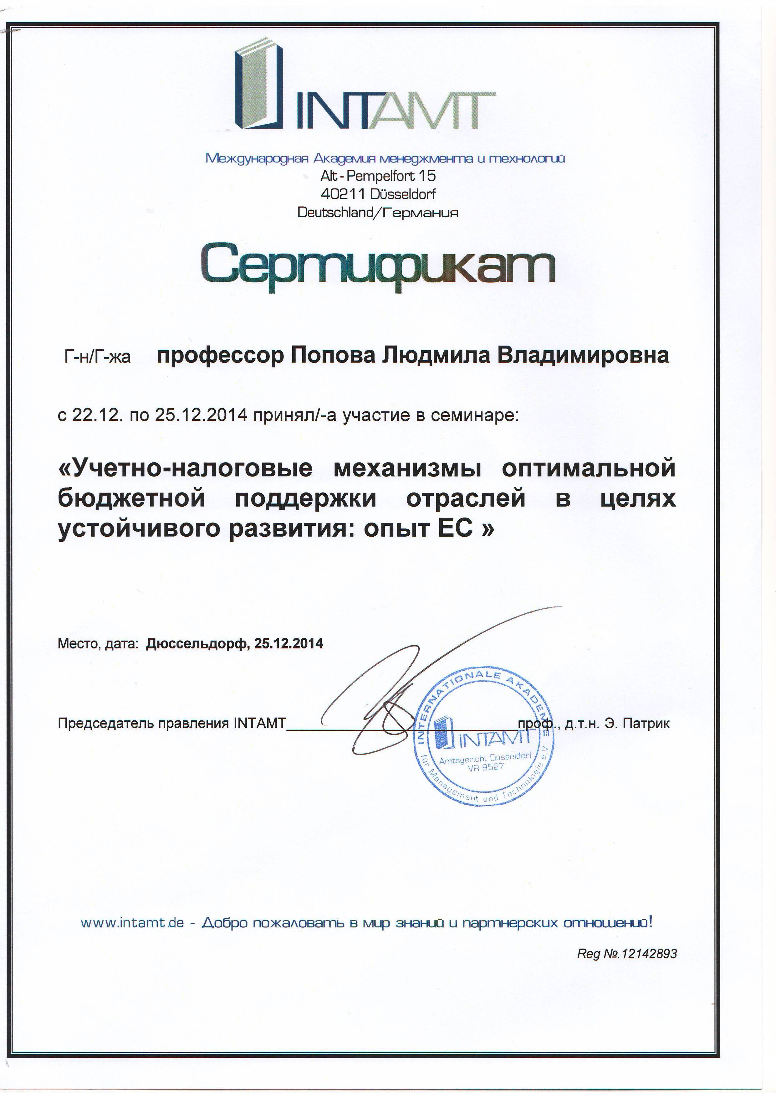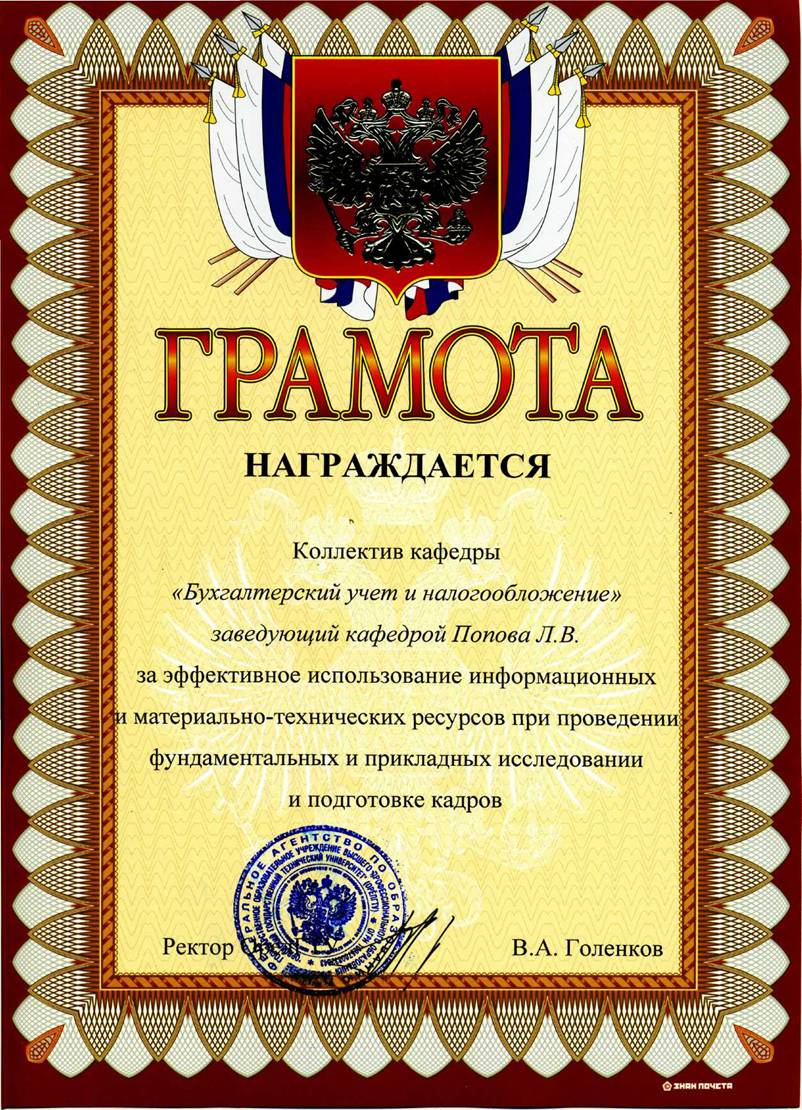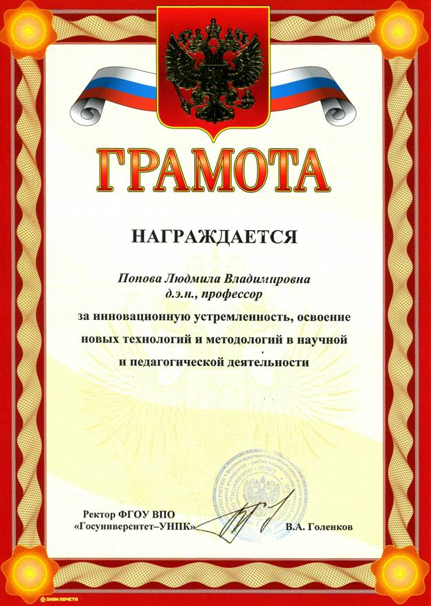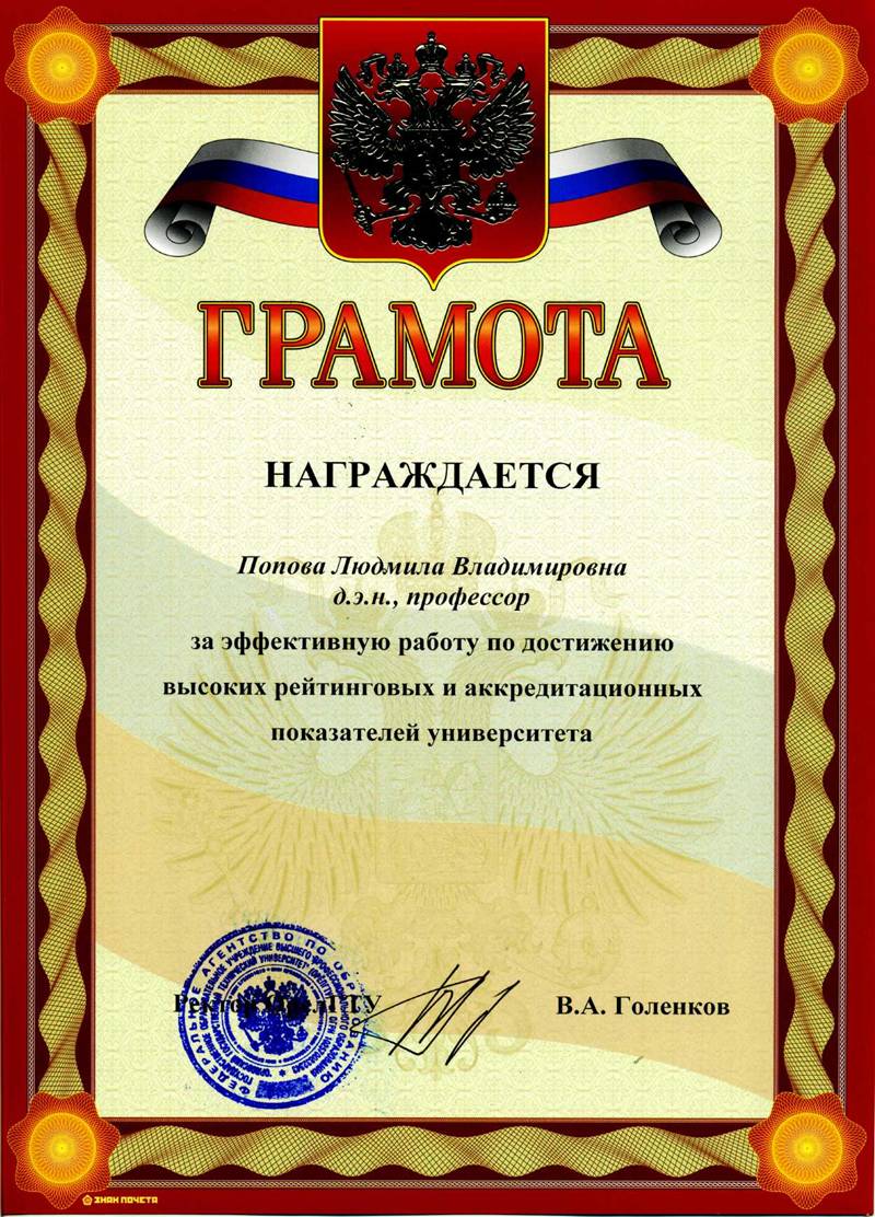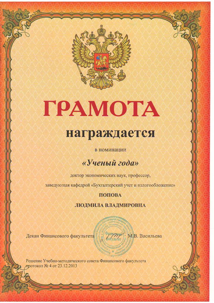 Дополнительная информация: В 1991 году защитила кандидатскую диссертацию на тему "Анализ потоварной издержкоемкости на предприятиях общественного питания" по специальности 08.00.12 "Бухгалтерский учет, статистика". В 1996 году защитила докторскую диссертацию на тему "Комплексная система учета, анализа и аудита в экономическом механизме коммерческих предприятий" по специальности 08.00.12 "Бухгалтерский учет, статистика". С 2000 года - заведующая кафедрой "Бухгалтерский учет и налогообложение", а также председатель Совета по защите диссертаций на соискание ученой степени кандидата и доктора экономических наук. В 2001 году Поповой Л.В. присвоено звание профессора. C 2010 года Попова Л.В. является федеральным экспертом качества профессионального образования. В 2011 году Поповой Л.В. присвоено звание члена-корреспондента Международной академии наук высшей школы. Ежегодно под руководством Поповой Л.В. выполняются гранты и государственные контракты. Попова Л.В. является главным редактором журнала «Экономические и гуманитарные науки», входящий в перечень ВАК. Основные сертификаты и награды за последние 5 лет