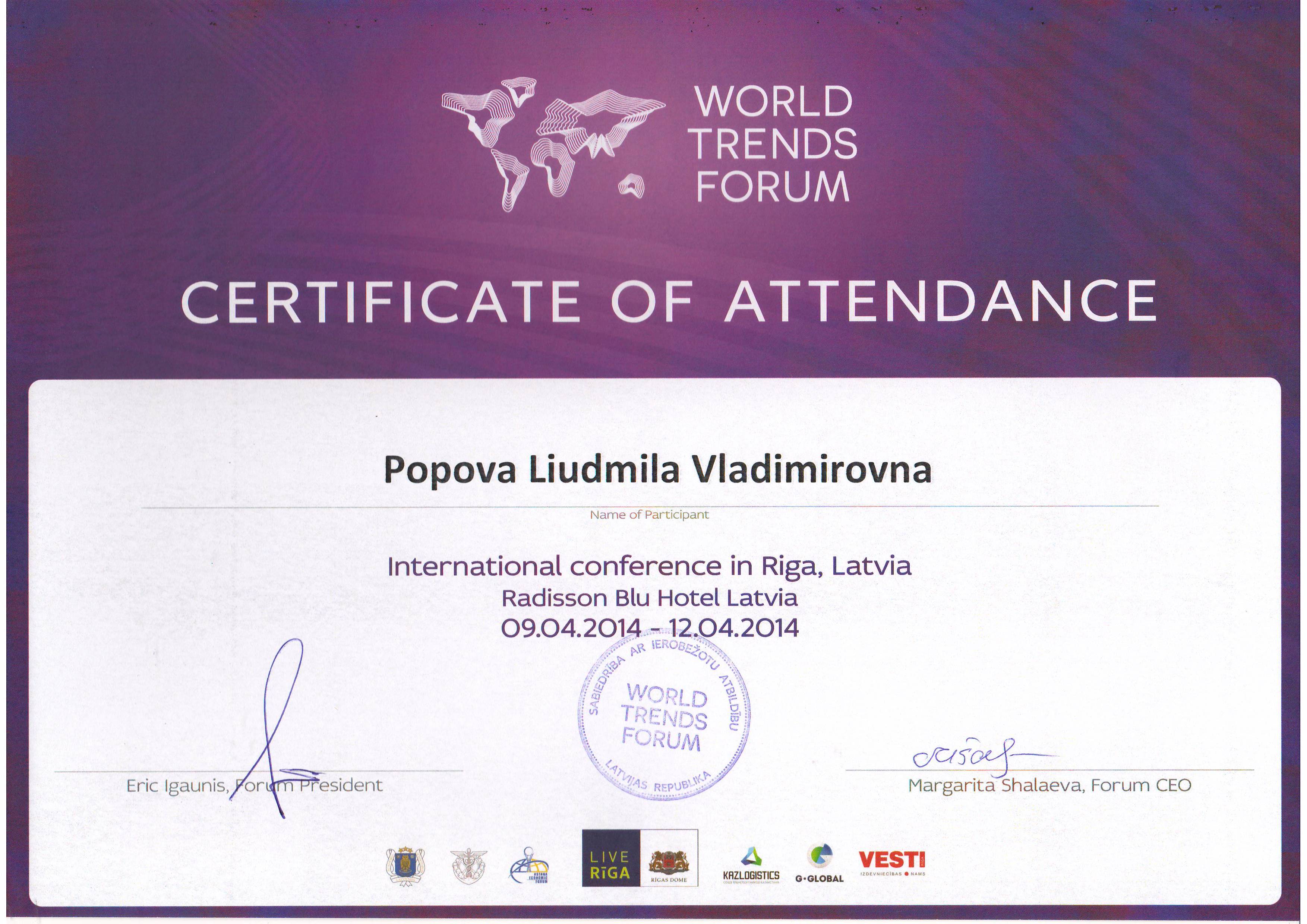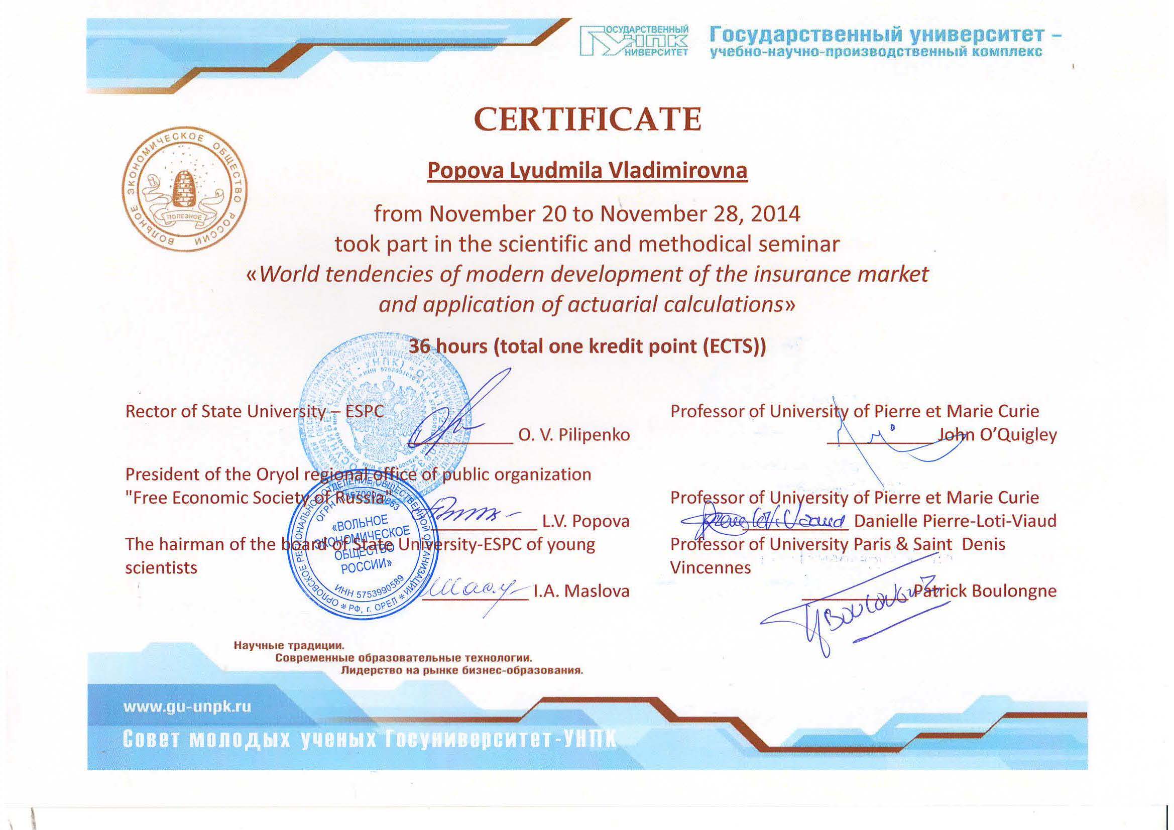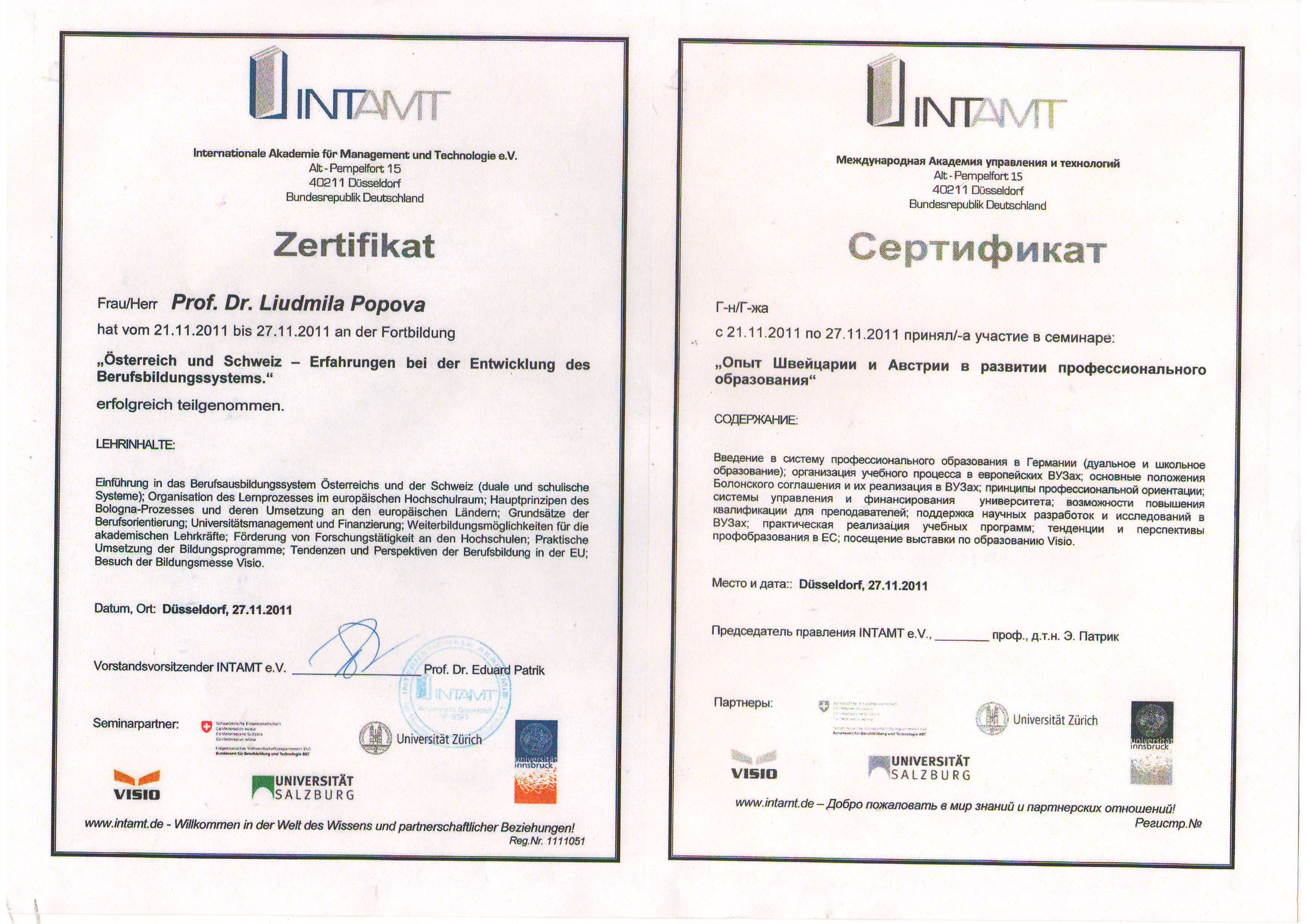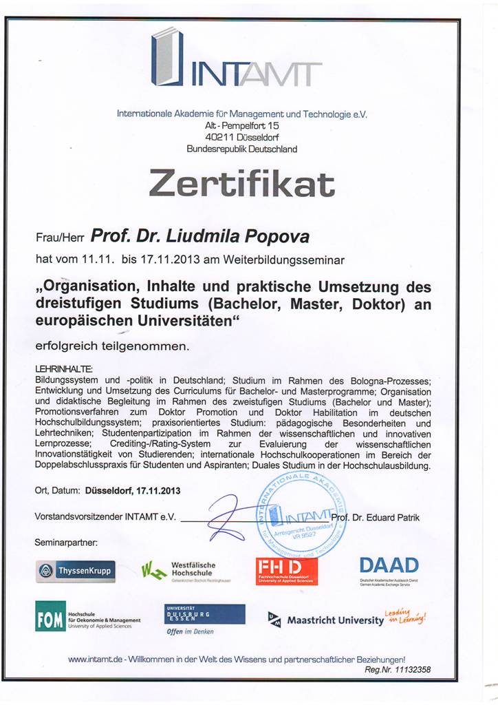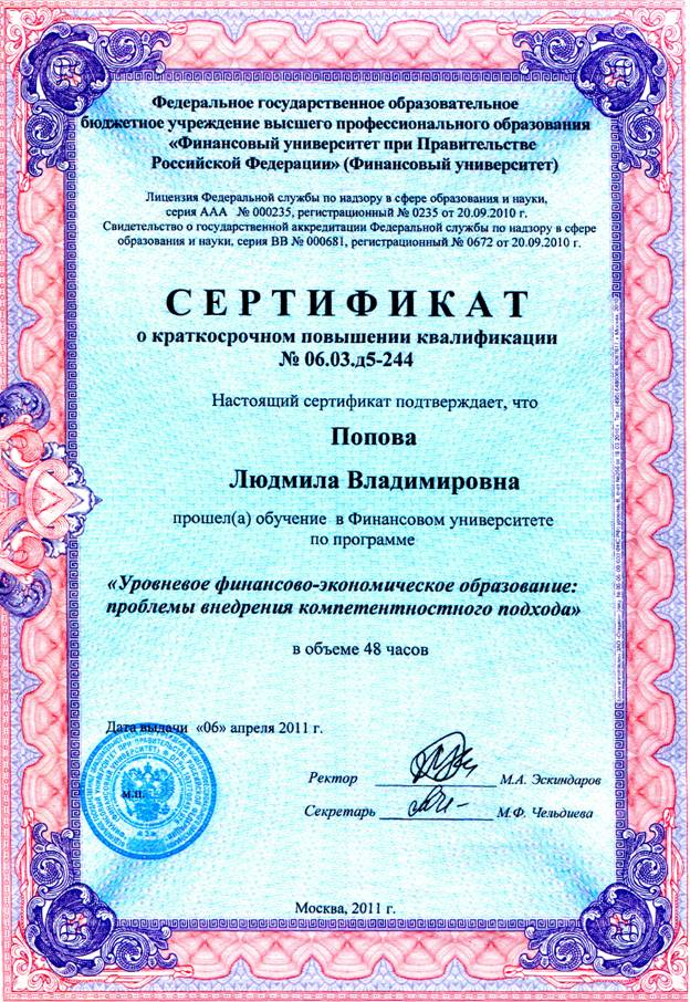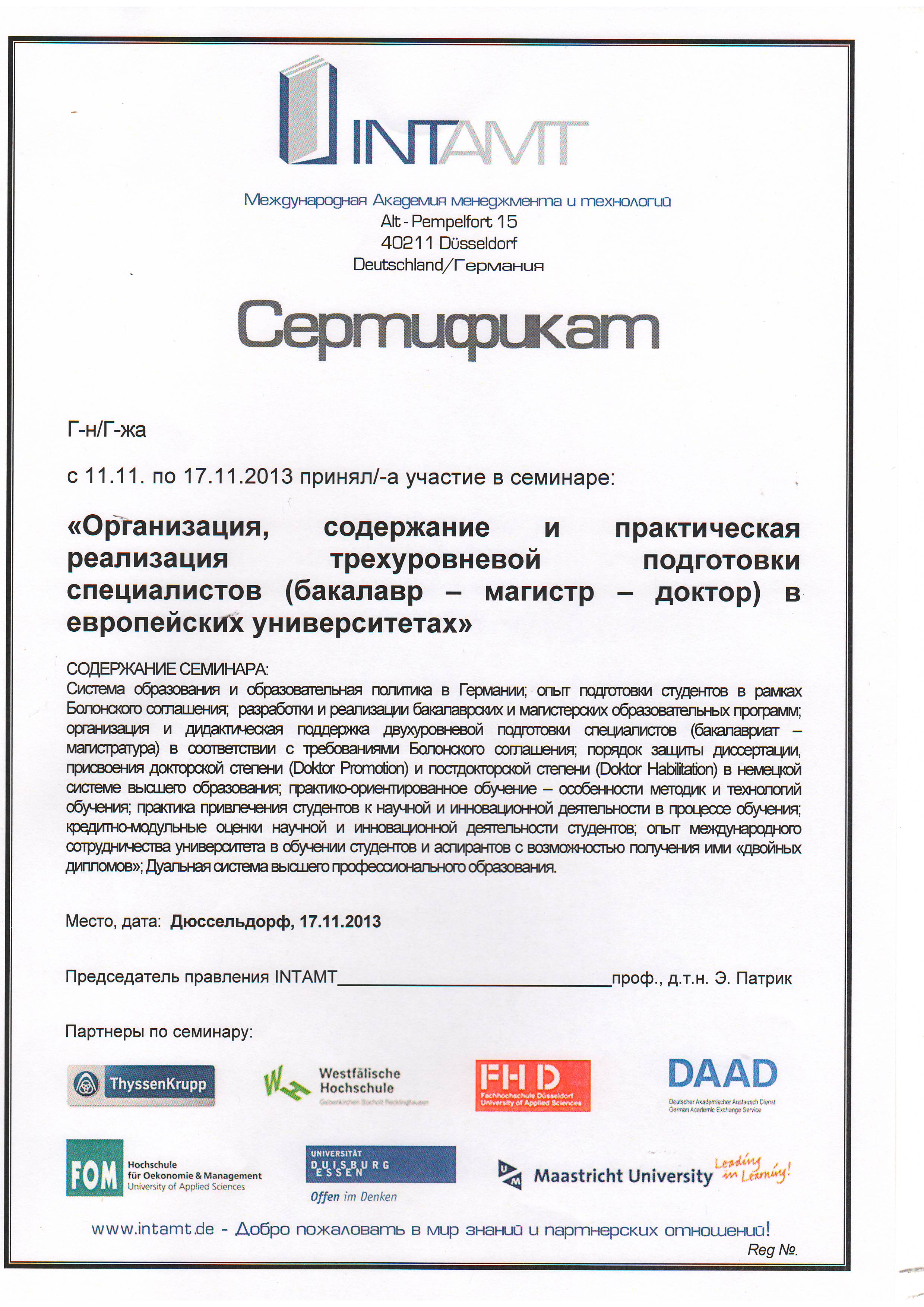 - Удостоверение о повышении квалификации № 0183657 от 06.06.2017 "Cистема управления подразделениями вуза: прогрессивная модель" 72 час. ОАО "Институт исследования товародвижения и конъюнктуры оптового рынка"