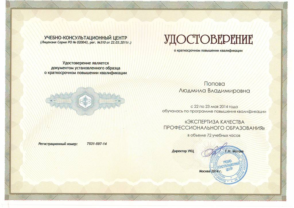 - Удостоверение о повышении квалификации № 1026 от 21.11.2017 "Повышение уровня профессиональной подготовки аттестованных экспертов, привлекаемых Рособрнадзором по контролю (надзору) в системе профессионального и высшего образования" 16 час. ООО "Консалтинг и менеджмент"