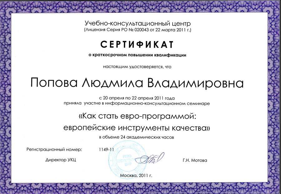 - Удостоверение о повышении квалификации № 571801265750 от 04.04.2017 "Управление проектами в образовательном учреждении" 72 час. ФГБОУ ВО "Орловский государственный университет имени И,С. Тургенева"