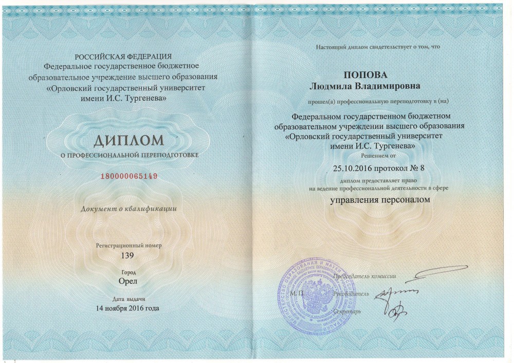 - Диплом о профессиональной переподготовке № 180000183089 от 22.12.2017 "Педагогика, психология и управление в высшей школе" 360 час. ФГБОУ ВО "Орловский государственный университет имени И.С. Тургенева"