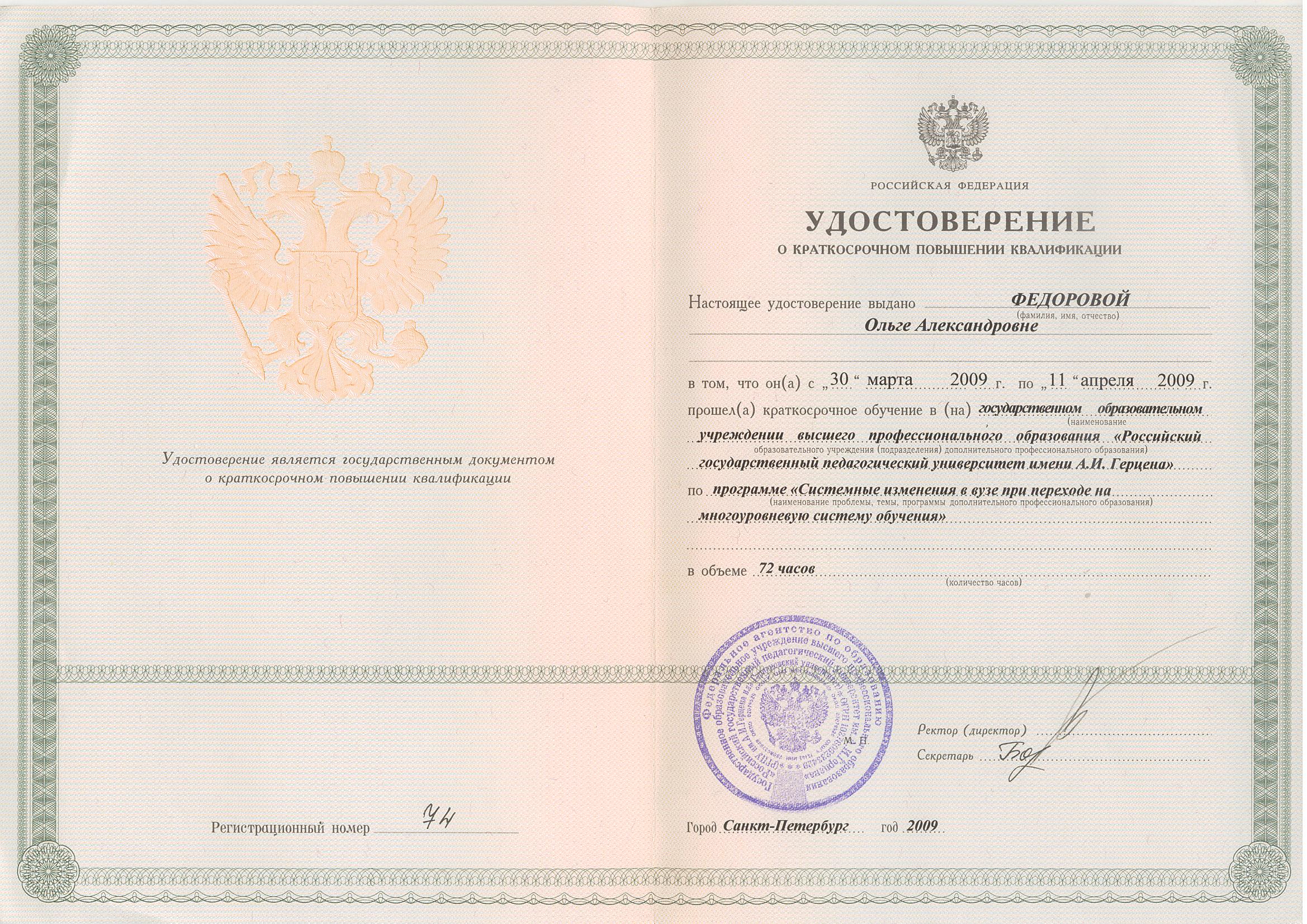 - Удостоверение о повышении квалификации № 74 от 11.04.2009 "Системные изменения в вузе при переходе на многоуровневую систему обучения" 72 час. ГОУ ВПО "РГПУ имени А.И. Герцена"