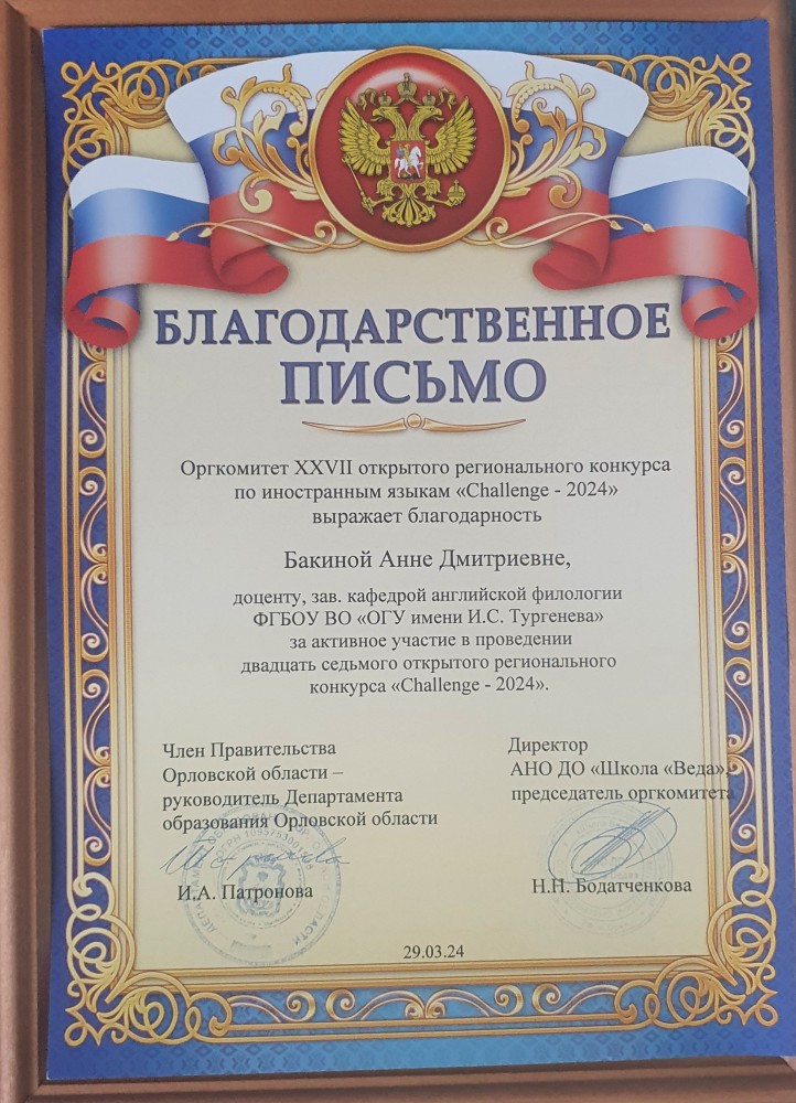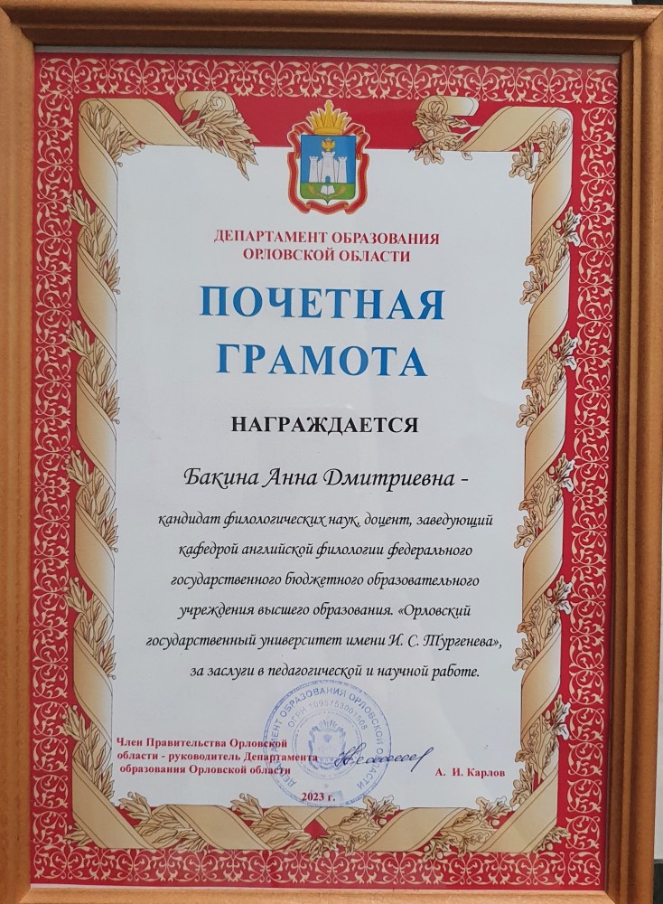 - Удостоверение о повышении квалификации № 571803378787 от 03.04.2023 "Актуальные вопросы лингвистики и лингводидактики в контексте межкультурной коммуникации " 16 час. ОГУ имени И.С. Тургенева