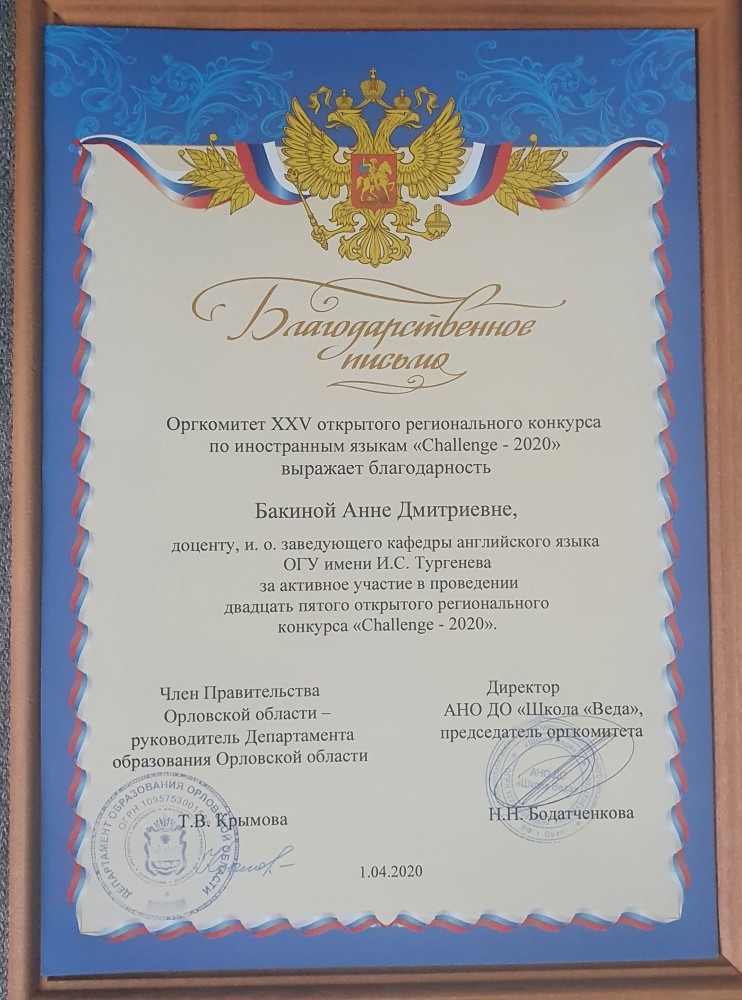 - Удостоверение о повышении квалификации № 0846 от 19.10.2020 "Вопросы современной филологии и проблемы методики обучения языкам" 26 час. Брянский государственный инженерно-технологический университет