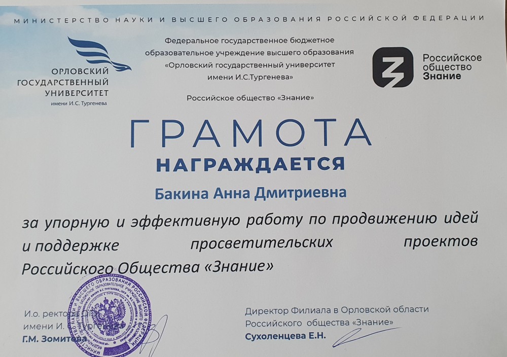 - Удостоверение о повышении квалификации № 571802741344 от 07.07.2022 "Требования охраны труда -- основные изменения в трудовом законодательстве РФ на 01.03.2022" 16 час. ОГУ имени И.С. Тургенева