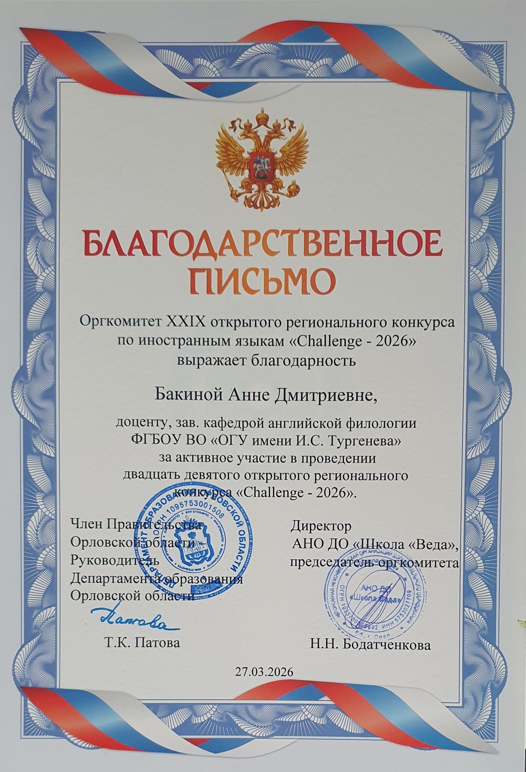 - Высшее (специалитет), Орловский государственный университет, Филология, 2001г.