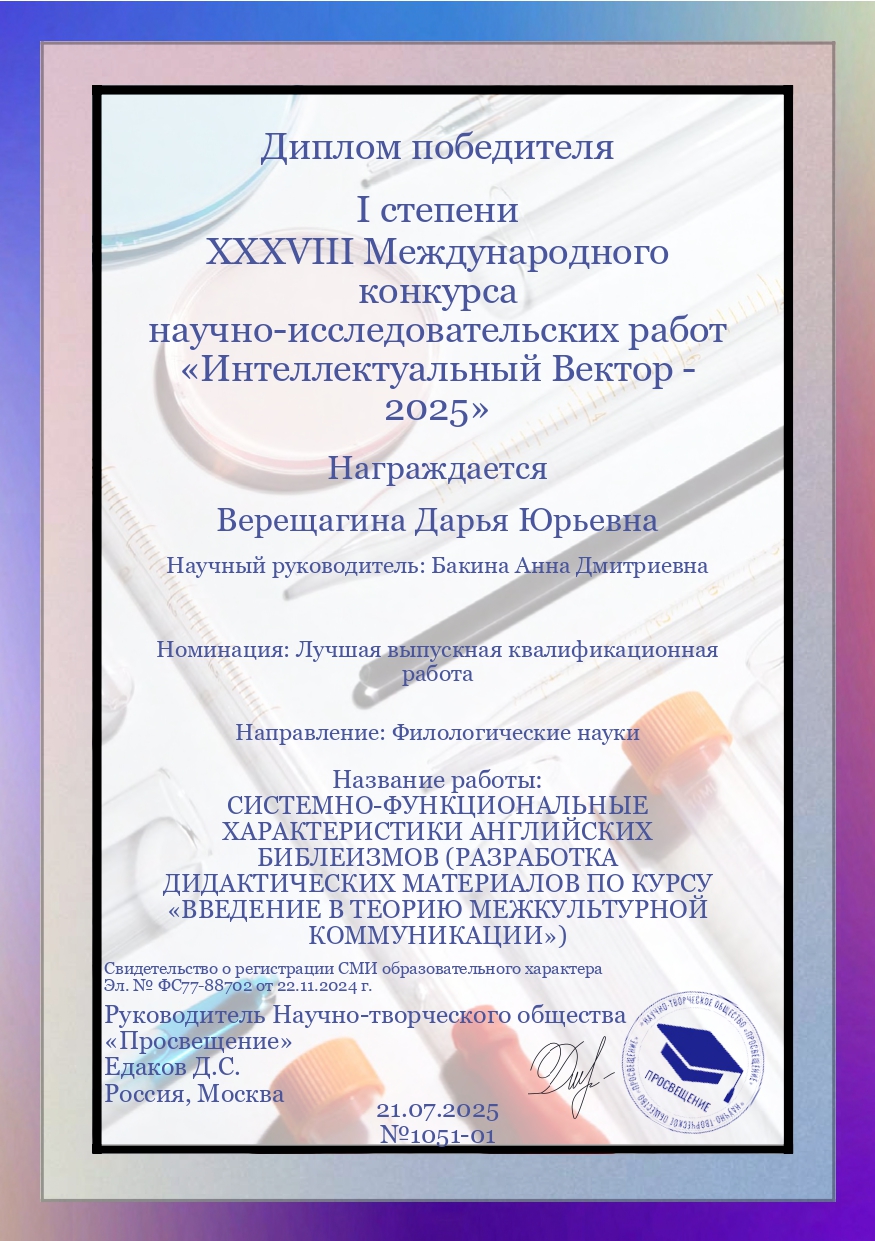 Публикации: 1. Бакина, А.Д. Актуальные проблемы фразеологии в контексте новейших исследований XXI века.: монография / А.Д. Бакина. - Издательский Дом "Академия Естествознания", 2025. - C.280. [Электронный ресурс]. - URL: https://elibrary.ru/item.asp?id=82966124. 2. Бакина, А.Д. Интегративное описание германской библейской фразеологии: монография / А.Д. Бакина. - ООО Модуль-К, 2025. - C.300. [Электронный ресурс]. - URL: . 3. Бакина, А.Д. К ВОПРОСУ О ПРАГМАТИКЕ ПЕРЕВОДА ФИЛЬМОНИМОВ / А.Д. Бакина // Теория языка и межкультурная коммуникация К3. - 2025. - № 3(58). - C.1-10. Doi: . [Электронный ресурс]. - URL: https://api-mag.kursksu.ru/api/v1/get_pdf/5863/. 4. Бакина, А.Д. и др. ПРАГМАТИКА ПЕРЕВОДА ФРАЗЕОЛОГИЧЕСКИХ ЕДИНИЦ БИБЛЕЙСКОГО ПРОИСХОЖДЕНИЯ В ПОЛИТИЧЕСКОМ ДИСКУРСЕ (на материале русского и английского языков) / А.Д. Бакина, В.А. Харченко // Вестник Северного (Арктического) федерального университета. - 2025. - № 3. - C.. Doi: . [Электронный ресурс]. - URL: . 5. Бакина, А.Д. и др. Современные исследования в фокусе сопоставительной фразеологии / А.Д. Бакина, Т.И. Койкова // Вестник Северного (Арктического) федерального университета, Серия «Гуманитарные и социальные науки. К2. - 2025. - № 2. - C.124-128. Doi: 10.37482/2687-1505-V427. [Электронный ресурс]. - URL: https://www.elibrary.ru/item.asp?id=82268478. 6. Бакина, А.Д. Способы прагматической адаптации при переводе текстов художественного дискурса / А.Д. Бакина // Вестник Московского государственного лингвистического университета. - 2025. - № 3. - C.. Doi: . [Электронный ресурс]. - URL: . 7. Бакина, А.Д. The Study of the Biblical Conceptosphere: the Binary Concept LIGHT/DARKNESS / А.Д. Бакина // Когнитивные исследования языка. - 2024. - № 2(58). - C.91-95. Doi: . [Электронный ресурс]. - URL: . 8. Абакумова, О.Б. и др. VIII Международная научно-практическая конференция «Язык. Культура. Коммуникация: изучение и обучение». Орел, 10-11 октября, 2024 / О.Б. Абакумова, А.Д. Бакина // Art Logos (Искусство слова) К 3. - 2024. - № 4(29). - C.186-196. Doi: 10.35231/25419803_2024_4_186. [Электронный ресурс]. - URL: https://lengu.ru/mag/art-logos/archive/145. 9. Бакина, А.Д. Анализ библейских концептов ‘soul’ / ‘душа’ и ‘spirit’ / ‘дух’ / А.Д. Бакина // "Актуальные вопросы германистики, романистики, русистики ", Екатеринбург, 01.01.1900. - Екатеринбург: Уральский государственный педагогический университет. , 2024. - C.12-19. Doi: . [Электронный ресурс]. - URL: . 10. Бакина, А.Д. Библейская фразеология в современной коммуникации / А.Д. Бакина // IV Всерос. науч. семинар для молодых ученых с междунар. участием, посвящ. 90-летию со дня рождения В. В. Колесова, Владимир, 01.01.1970. - Владимир: , 2024. - C.494-504. Doi: . [Электронный ресурс]. - URL: .