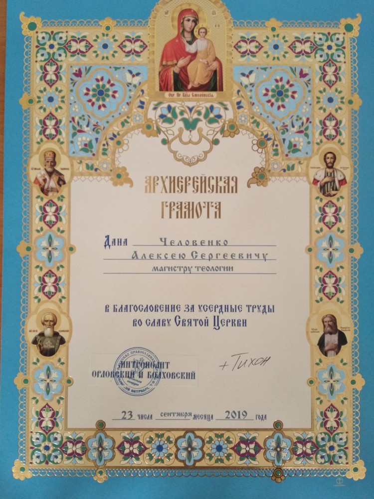 - Удостоверение о повышении квалификации № 571802048304 от 05.10.2019 "Теология и религиоведение: социально значимые проблемы и пути их решения" 72 час. ФГБОУ ВО "Орловский государственный университет имени И.С. Тургенева"