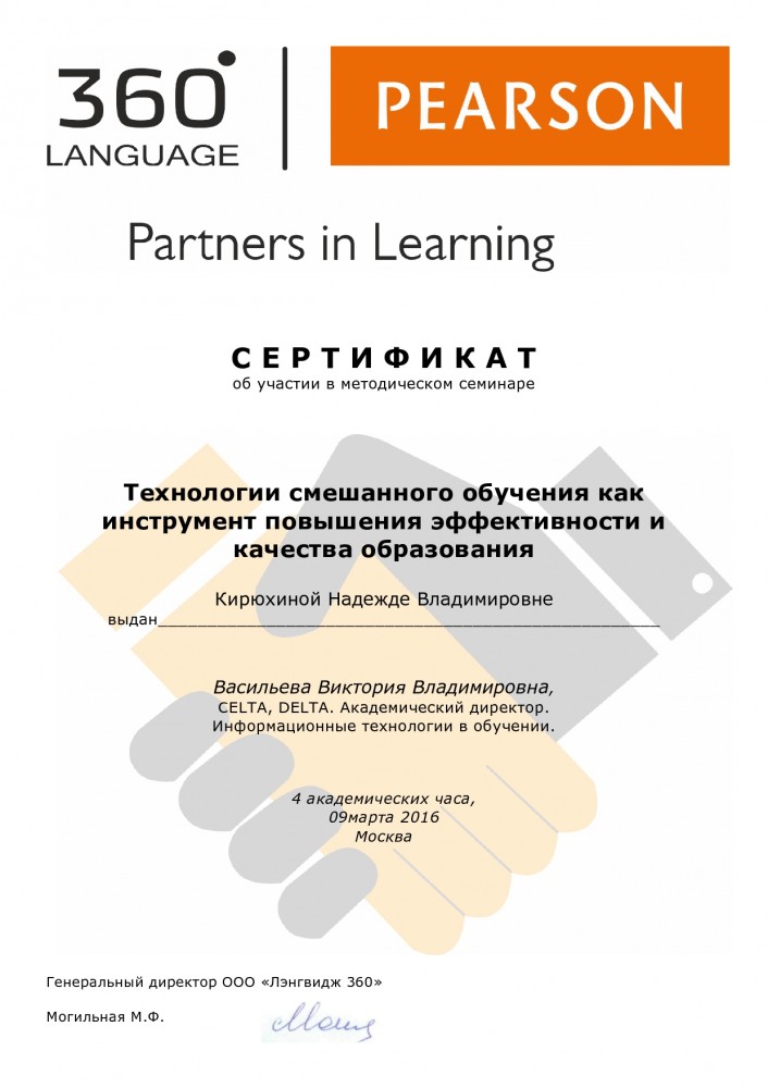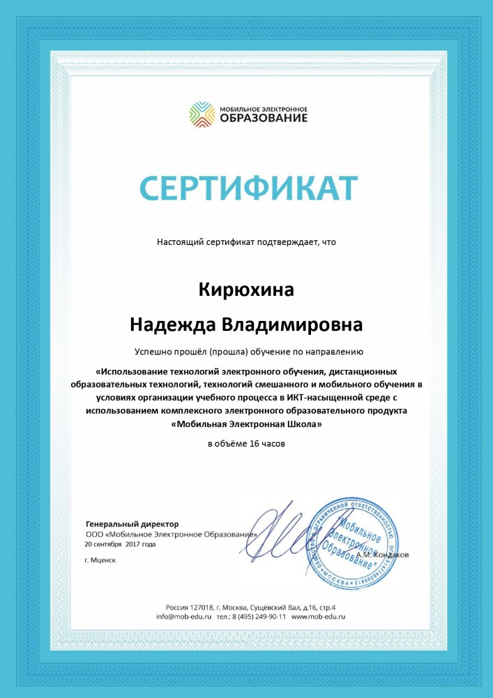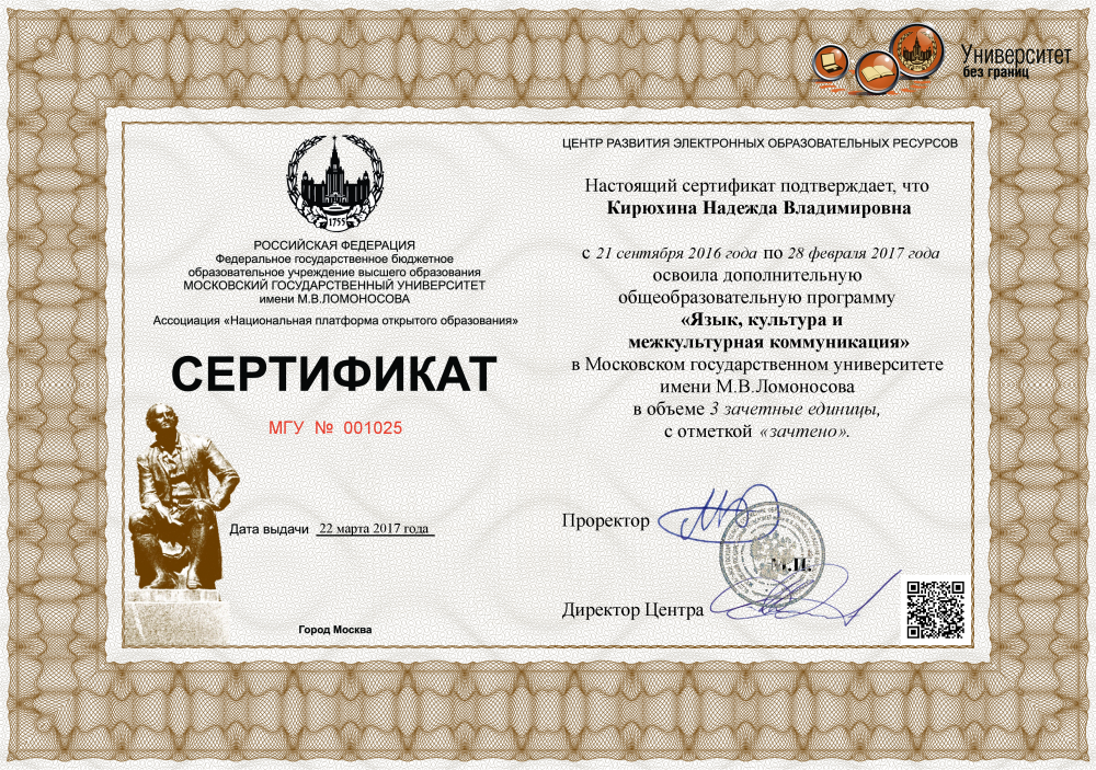 - Удостоверение о повышении квалификации № 180000460684 от 26.02.2018 "Информационно-коммуникационные технологии в высшей школе" 72 час. ОГУ имени И.С. Тургенева