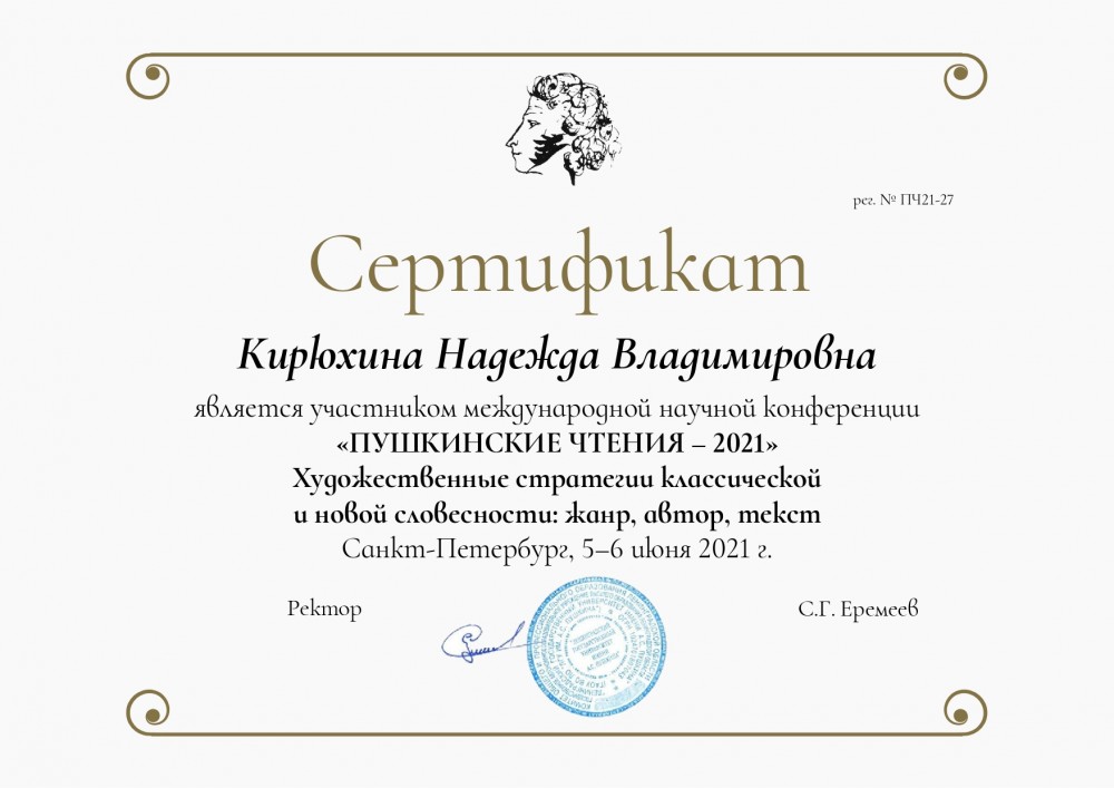 Дополнительная информация: С 2017 г. по настоящий момент Кирюхина Н. В. является штатным преподавателем кафедры английской филологии. В 2018 г. Кирюхина Н. В. была зачислена в очную аспирантуру по специальности 45.06.01 – Языкознание и литературоведение. В 2021 г. Кирюхина Н. В. успешно закончила аспирантуру с присвоением квалификации «Исследователь. Преподаватель-исследователь». Кирюхина Н. В. ведет практические курсы по основным рабочим программам бакалавриата и постоянно является куратором студенческих групп 3 курса на ступени бакалавриата. Наряду с разносторонней учебно-методической и организационно-методической работой Кирюхина Н. В. занимается научно-исследовательской работой, результаты которой представляются ежегодно в выступлениях на всероссийских и международных научных конференциях: Кирюхина Надежда Владимировна является членом организационного комитета IV, V, VI международной научно-практической конференция «Язык. Культура. Коммуникация: изучение и обучение», принимает участие в организации региональных и Всероссийских студенческих конференций в Институте иностранных языков, в публикации монографий и статей. Имеются победители-студенты в личном зачете с призовыми местами на всероссийских и международных конкурсах перевода. Также является постоянным членом жюри Всероссийской молодежной научно-практической конференции Орловского государственного университета имени И. С. Тургенева "МИФ". С 2024 года является членом жюри регионального этапа всероссийской олимпиады школьников по английскому языку.