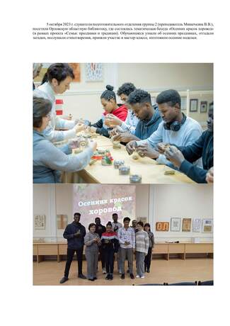 5 октября 2023 г. слушателиподготовительного отделениягруппы 2(преподаватель Мишечкина В.В.),посетили Орловскую областную библиотеку, гдесостоялась тематическая беседа «Осенних красок хоровод» (в рамках проекта «Семья: праздники и традиции). Обучающиеся узнали об осенних праздниках, отгадали загадки, послушали стихотворения,приняли участие в мастер-классе, изготовили осенние поделки