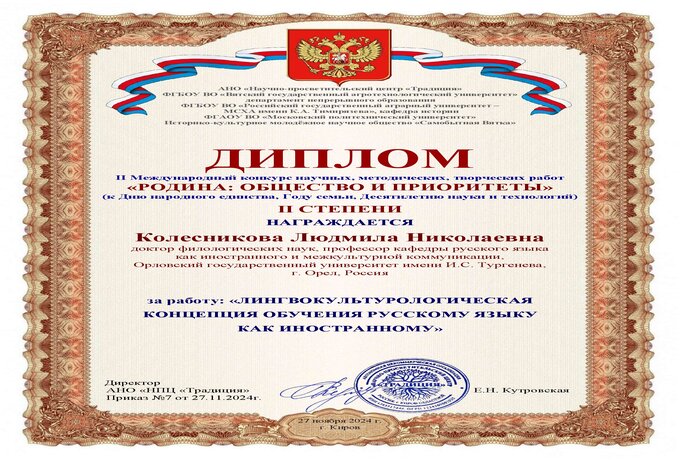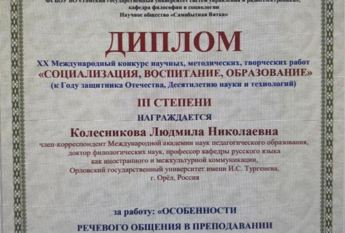 Колесникова Людмила Николаевна — член-корреспондент Международной академии наук педагогического образования, доктор филологических наук, профессор кафедры русского языка как иностранного и межкультурной коммуникации победила во П Международном конкурсе научных, методических, творческих работ «РОДИНА: ОБЩЕСТВО И ПРИОРИТЕТЫ» и получила Диплом Победителя.