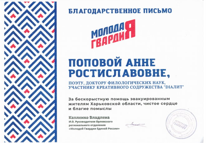 Благодарность профессору Анне Ростиславовне Поповой