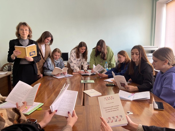 26 февраля 2025 г. на кафедре русского языка Института филологии состоялась лекция-беседа «Краеведческая лексикография». Студенты познакомились со словарями разного типа, изданными в г. Орле и репрезентирующими особенности языка родного края.