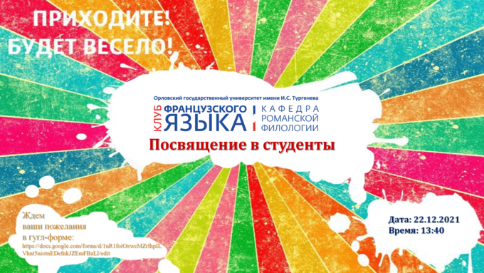 Первый опыт сотрудничества кафедры романской филологии с образовательным центром «Созвездие Орла» 29.11.2024 Подробнее ОбразованиеКультураСотрудничество