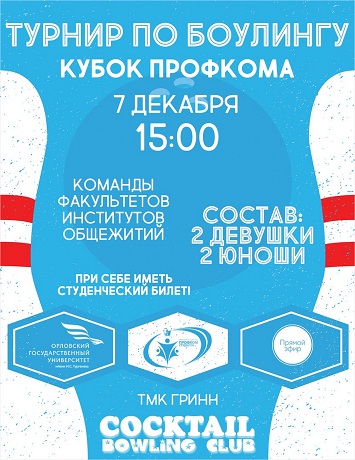 7 Декабря 2017 года в 15: 00 Состоится турнир по боулингу на кубок профкома... В боулинг клубе COCKTAIL CLUB комплекса МЕГА ГРИНН ,приходите болеть за свои команды... УРА!!!