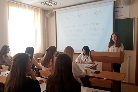 23 апреля в рамках мероприятия «Неделя науки-2025» на базе кафедры уголовного права и процесса под руководством доцента кафедры Е.А. Маслаковой состоялось заседание студенческой секции «Актуальные проблемы уголовного права и криминологии».