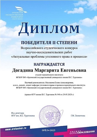 Поздравляем студентов 4 курса направления подготовки 40.03.01 Юриспруденция: Догадину Маргариту Евгеньевну (группа 11Ю) и Полухину Ксению Олеговну (группа 12Ю) с получением дипломов победителей II степени за участие во Всероссийском студенческом конкурсе научно-исследовательских работ «Актуальные проблемы уголовного права и процесса» (приказ ОГУ имени И.С. Тургенева № 948 от 29.05.2025)!