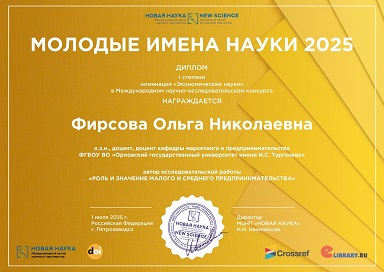 Подведены итоги Международного научно-исследовательского конкурса «МОЛОДЫЕ ИМЕНА НАУКИ 2025», в котором приняла участие доцент нашей кафедры Ольга Фирсова c научно-исследовательской работой "Роль и значение малого и среднего предпринимательства".