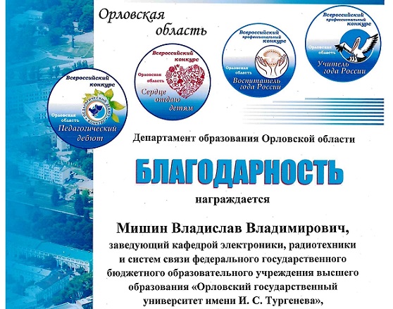 Заведующий кафедрой электроники, радиотехники и систем связи Мишин В.В. награжден благодарностью департамента образования Орловской области