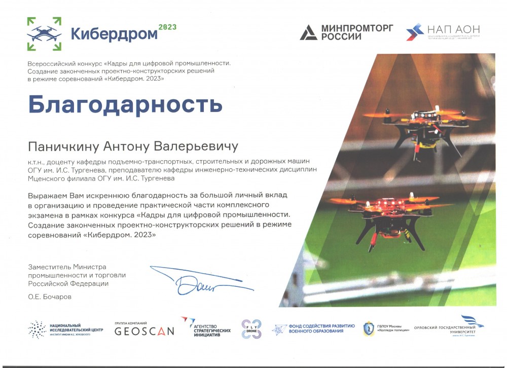 Всероссийский конкурс "Кадры для цифровой промышленности" . Созддание законченных проектно-конструкторских решений в режиме соревнований "Кибердром 2023" при поддерже Министерства промышленности и торговли выражает благодарность к.т.н., доценту кафедры подъемно-транспортных, строительных и дорожных машин ОГУ имени И.С. Тургенева Паничкину Антону Валерьевичу за организацию и проведение практической части экзамена в рамках конкурса "Кибердром 2023"