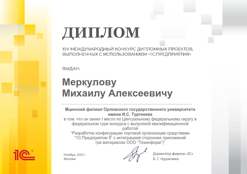 Выпускник Мценского филиала ОГУ им. И.С. Тургенева, золотой призер вузовского чемпионата по стандартам Ворлдскиллс в компетенции «IТ-решения для бизнеса на платформе «1С: Предприятие 8»» Меркулов Михаил Алексеевич стал победителем в Центральном федеральном округе, представив на конкурс свою выпускную квалификационную работу на тему «Разработка конфигурации торговой организации средствами "1С:Предприятие 8" с интеграцией сторонних приложений» (руководитель ВКР Мозгунова Н.Н.).
